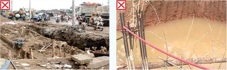 Cống thoát nước công cộng không có nắp đậy, hố chôn cột điện không lấp