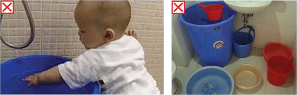 Gia đình có trẻ nhỏ tuyệt đối không được chứa, tích nước trong thùng, thau, xô, chậu,… Không để trẻ nhỏ vày, nghịch nước vì sẽ có nguy cơ rất cao gây tai nạn đuối nước nếu các em không được thường xuyên có người lớn bên cạnh giám sát, trông coi (như hình dưới).